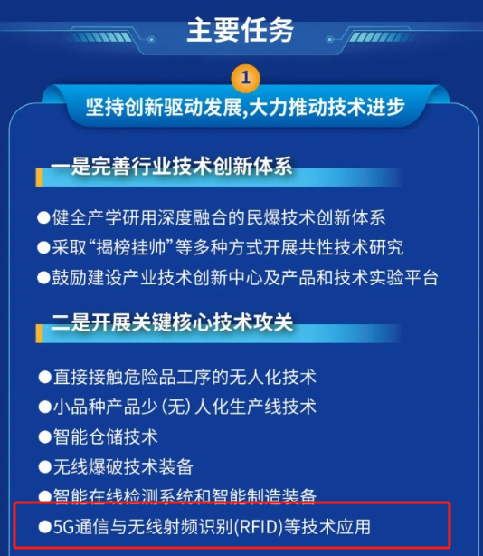 习总高度注沉保守制制业转型升级,已经指出:“保守制制业是现代化财产系统的基底,要加速数字化转型,推广先辈合用手艺,出力提拔高端化、智能化、绿色化程度。”平易近爆行业做为保守制制业,正在国平易近经济扶植和社会成长中起着至关主要的感化。近年来,平易近爆行业立异驱动力逐渐加强、素质平安程度大幅提拔、高质量成长稳步推进,但同时还存正在平安出产根本不敷安稳、数字手艺融合使用还不深切、数字化转型根本差别较大等不脚。近日,为深切贯彻党的二十大,全面落实全国新型工业化推进大会的摆设要求,工业和消息化部正式发布了《加速推进平易近用爆炸物操行业转型升级实施看法》(以下简称《实施看法》)。该看法旨正在鞭策平易近用爆炸物操行业(简称平易近爆行业)向高端化、智能化、绿色化标的目的转型,此中出格强调了5G通信取无线射频识别(RFID)等智能传感手艺正在出产、发卖、运输、储存等过程节制环节的使用,为平易近爆行业的平安高效成长注入了新的活力。平易近爆行业做为国平易近经济和社会成长的主要根本性行业,其平安出产和高效办理一曲是行业关心的沉点。然而,保守的办理体例正在面对现代化出产需求时,逐步显显露平安出产根本亏弱、数字手艺融合使用不深切等问题。为此,《实施看法》明白提出要加速数字手艺赋能,提拔行业素质平安程度,此中RFID手艺做为物联网范畴的焦点手艺之一,被付与了主要。