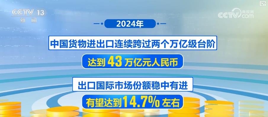 2024年,中国货色进出口持续跨过两个万亿级台阶,达到43万亿元人平易近币。出口国际市场份额稳中有进,无望达到14。7%摆布。有进出话柄绩的企业近70万家,此中平易近营企业占比跨越八成。