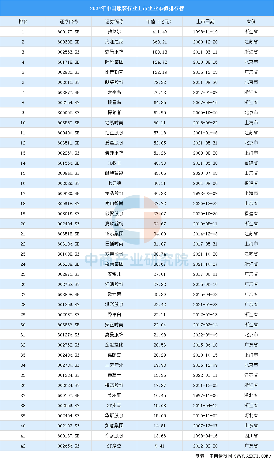 中商谍报网讯:中商财产研究院数据库显示,2024年中国服拆行业市值最大的十名上市企业别离是雅戈尔、海澜之家、森马服饰、际华集团、比音勒芬、朗姿股份、承平鸟、报喜鸟、更多材料请参考中商财产研究院发布的《中国服拆市场前景及投资机遇研究演讲》,同时中商财产研究院还供给财产大数据、财产谍报、行业研究演讲、行业、可行性研究演讲、财产规划、财产招商、财产链招商调查&推介会、“十五五”规划等征询办事。中商谍报网卑沉取学问产权。如发觉本坐文章存正在版权问题,烦请联系,我们将及时沟通取处置。