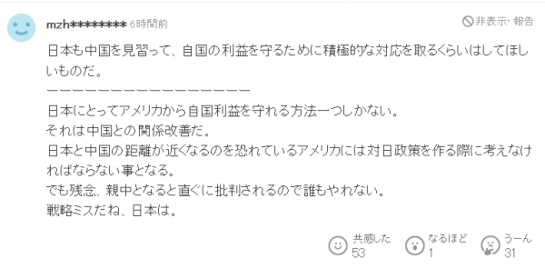 这是改善取中国的关系。美忌惮中日关系改善,因而正在制定对日政策时必需考虑日本的感触感染。但可惜的是,一旦日本亲中,顿时就会遭到,这是日本的计谋失误。从这段评论也能看出,日本人并不是想亲中,而是以亲近中国做为手段,美国不要日本的好处。这几年来,日本人对于美国不满程度越来越高,可是日本的各方面都被美国牢牢握正在手里,想要逆天改命并不容易。